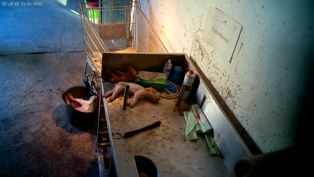 Eine der Kameras filmt direkt über einem Metalltisch, über dem ein Zettel mit der Aufschrift ‚Tötungsplatz‘ an der Wand hängt – ein makaberer Hinweis auf das, was hier passiert. Auf dem Tisch liegt bereits ein regungsloses Ferkel, links daneben steht ein Einkaufswagen, in dem sich dicht gedrängt lebendige Ferkel befinden. Der Mitarbeitende greift in den Wagen und nimmt eines der Ferkel, kaum größer als seine Hand. Mit dem bereitliegenden kleinen Knüppel versetzt er dem Ferkel einen kurzen, hörbaren Schlag auf den Kopf. Anschließend hält er es kopfüber in eine Tonne, die bis zum Rand mit blutverschmierten, toten Ferkelkörpern gefüllt ist. Nun folgt die eigentliche Tötung, das „Entbluten durch Kehlschnitt von Ohr zu Ohr mit Durchtrennung aller Weichteile und beider Halsschlagadern“, wie es in einer Anleitung für Schweinehalter heißt.